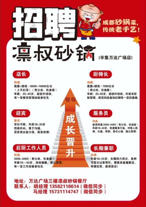 4.以上岗位要求:男女不限,身体健康,服从管理,热爱餐饮服务行业!